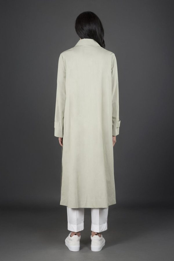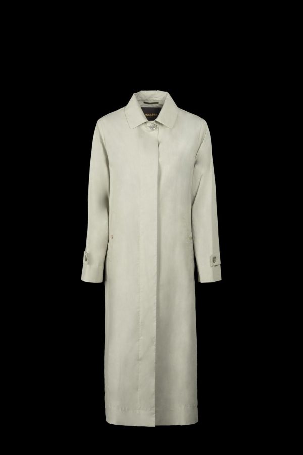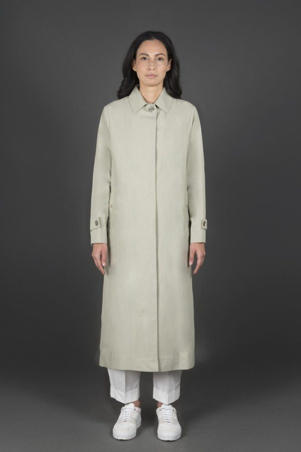 Trench monopetto dalla linea pulita e sartoriale realizzato in robusta tela di cotone misto lino con un aspetto “natural froissé” (leggermente sgualcito per creare un aspetto rilassato e non troppo formale). Presenta una naturale e modesta resistenza all’acqua grazie all’intensità delle battute di tessitura.