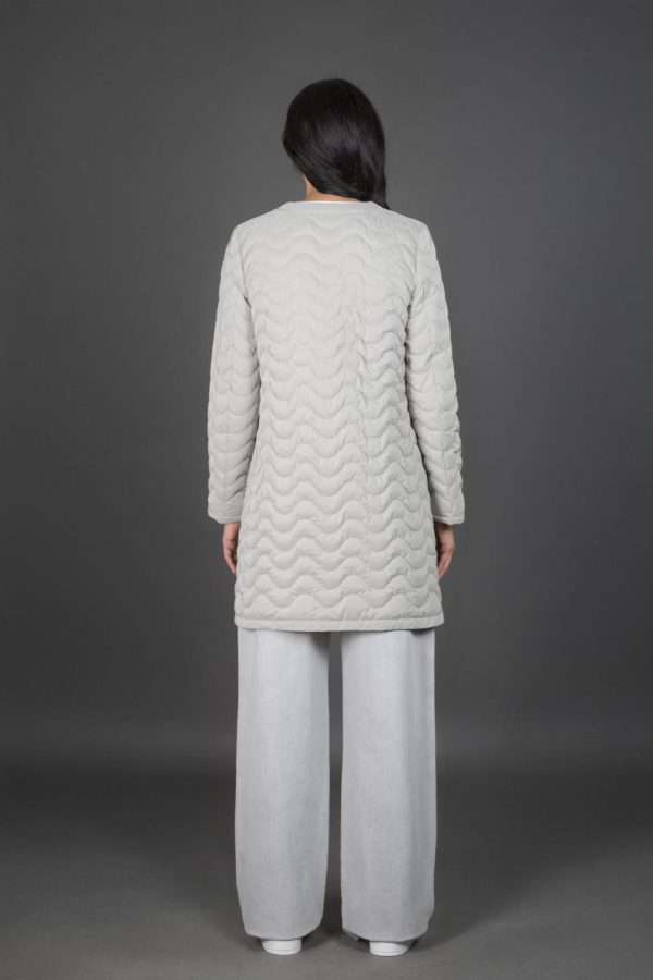 Imbottito in piuma d’oca e trapuntato a “onda”, realizzato in microfibra cangiante dall’aspetto serico e con mano pesca.