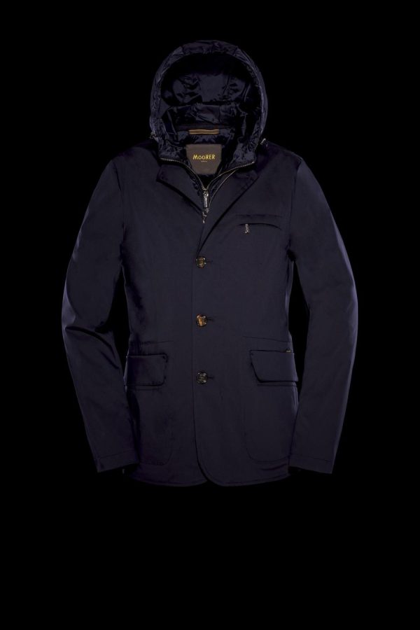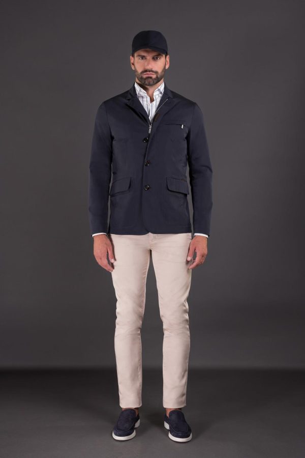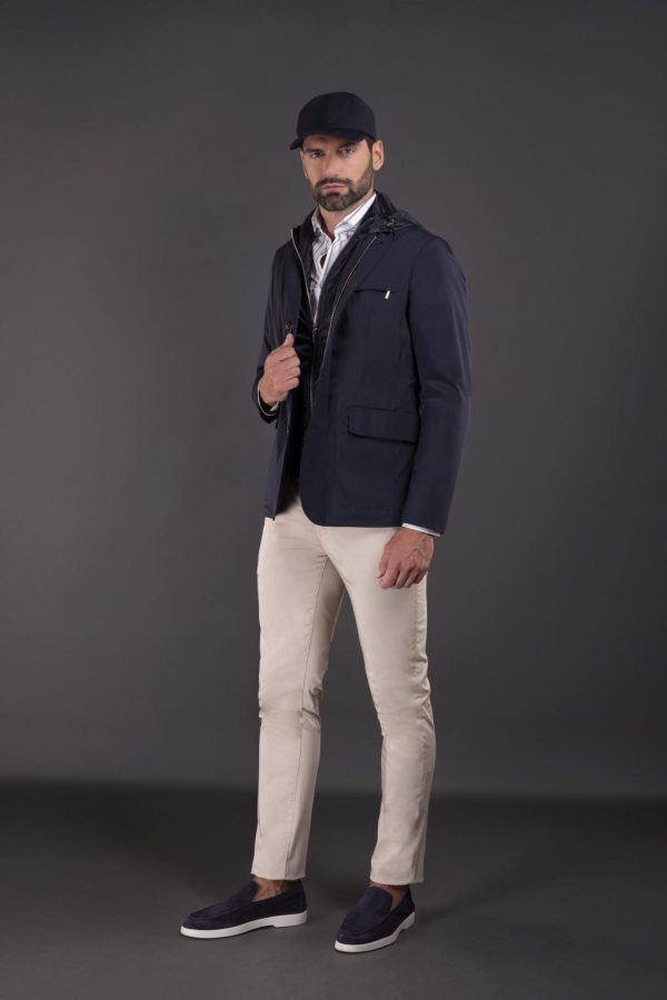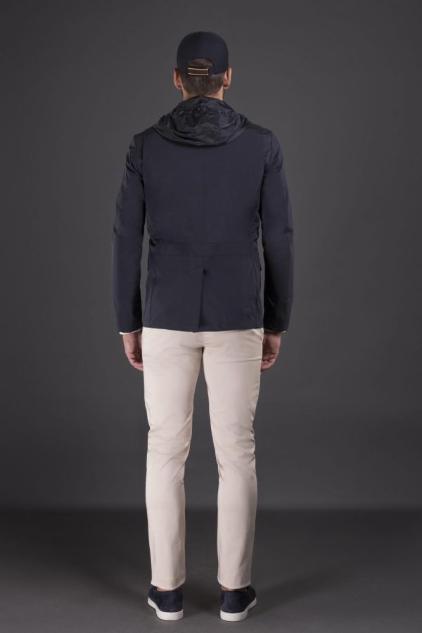 Giacca 3 bottoni semi foderata con corpetto staccabile e cappuccio. Realizzata in finissimo raso stretch idrorepellente dall’aspetto cangiante.